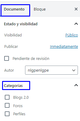 En la barra lateral derecha deberás hacer clic en «Documento» y luego en «Categorías».